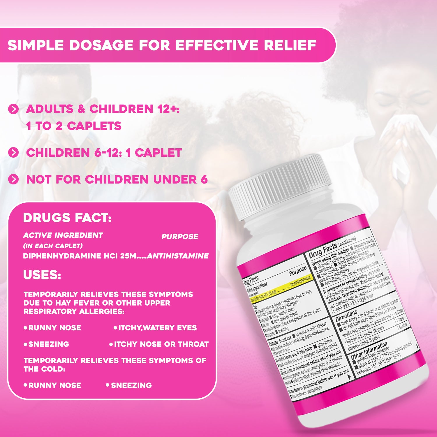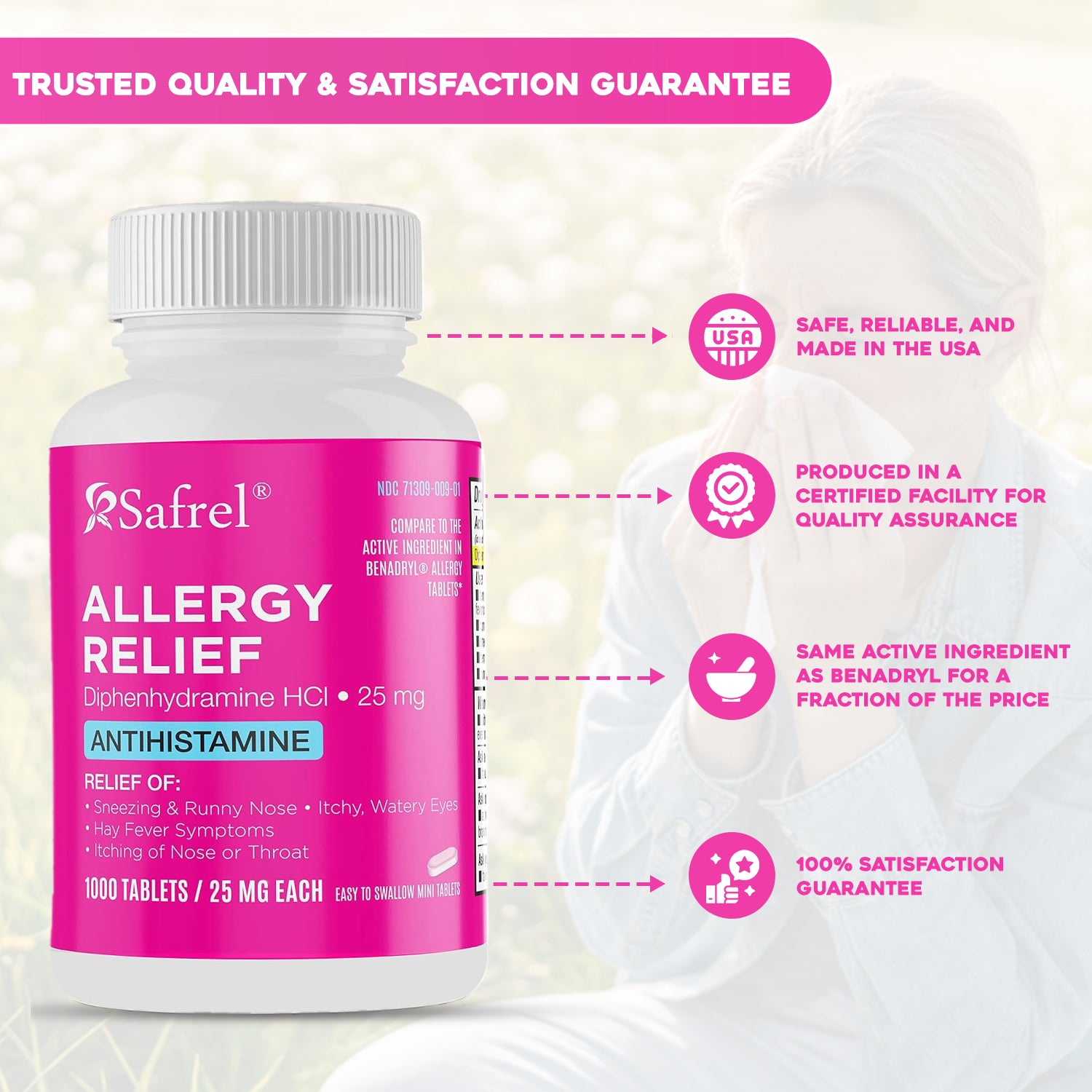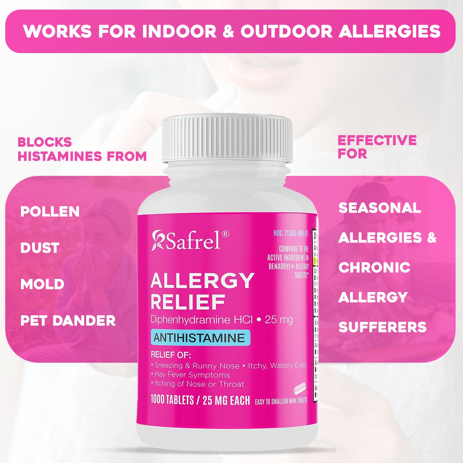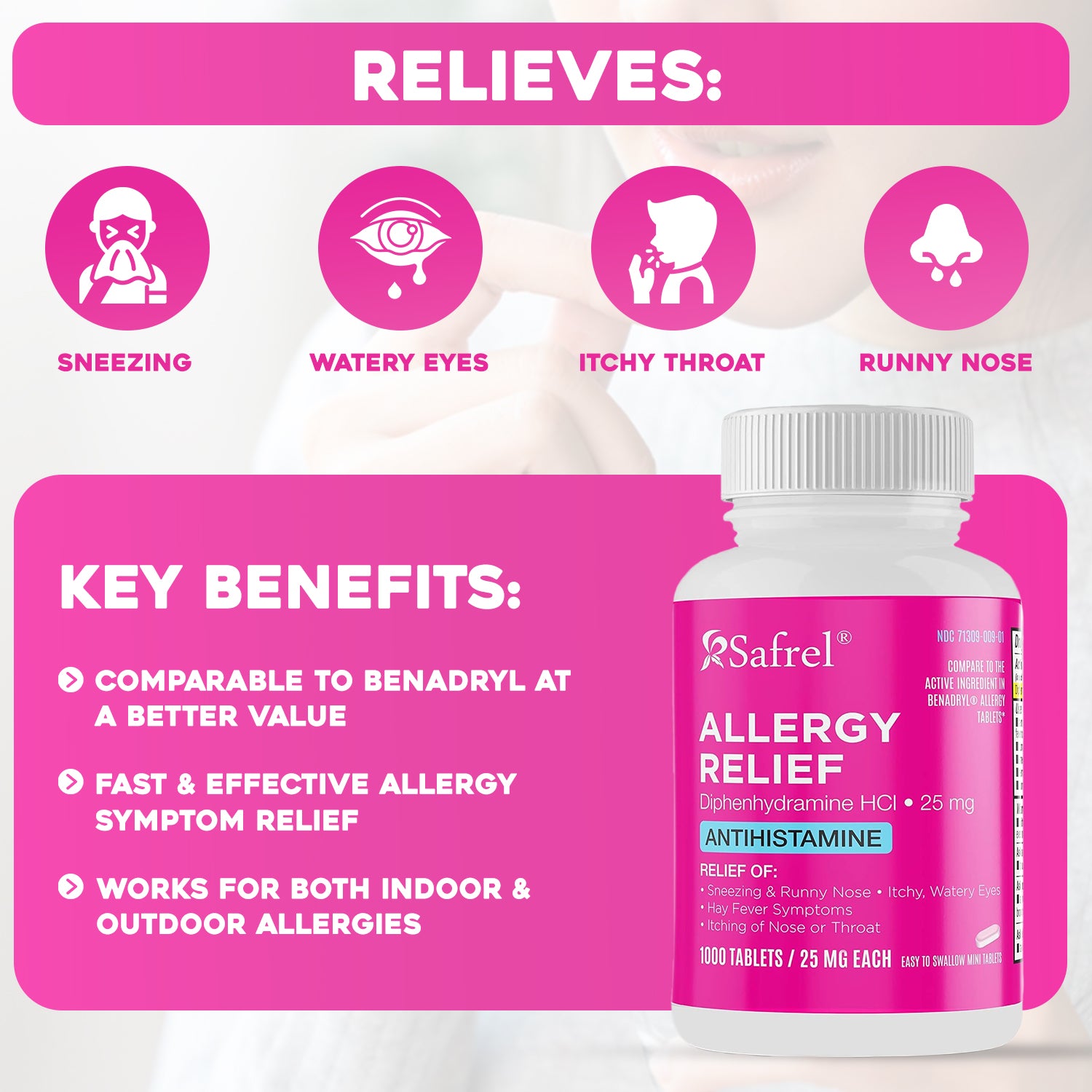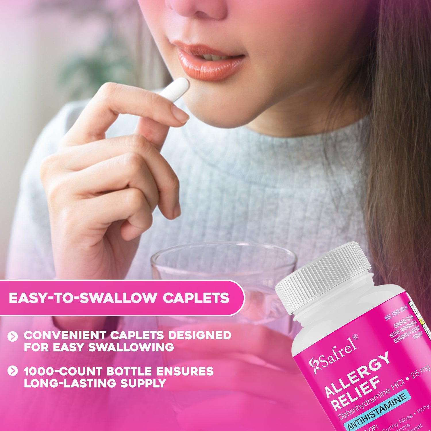 Safrel Allergy Relief Medication Diphenhydramine HCl Caplets 25 mg (1000 Count), Antihistamine Relieves Sneezing, Runny Nose, Hay Fever, Itchy Eyes and Throat, Seasonal Indoor & Outdoor Allergy Pills