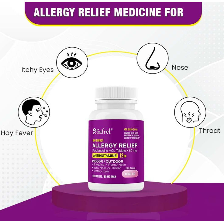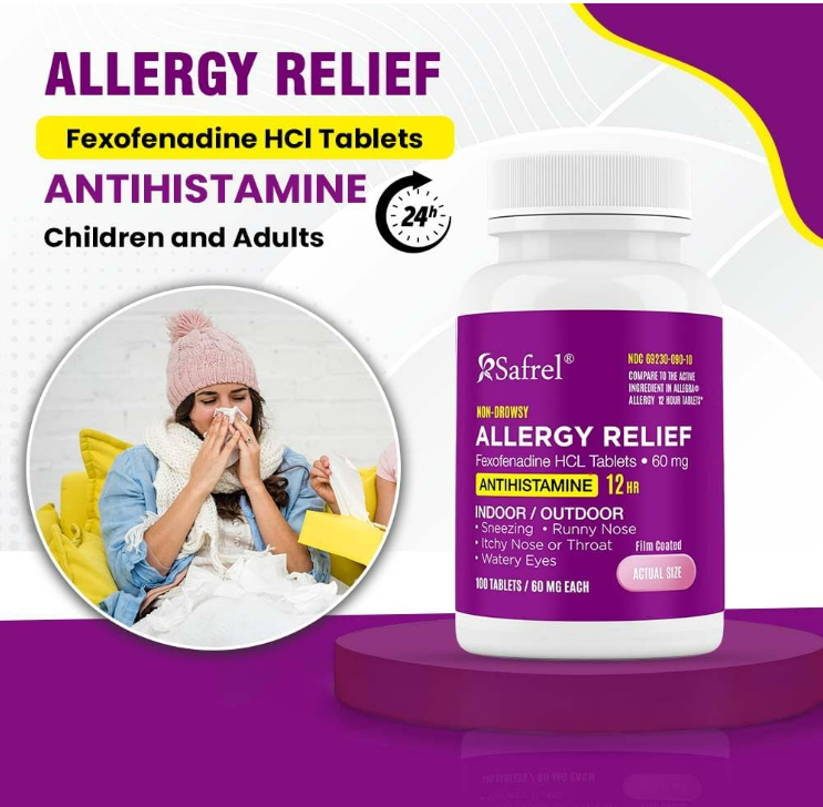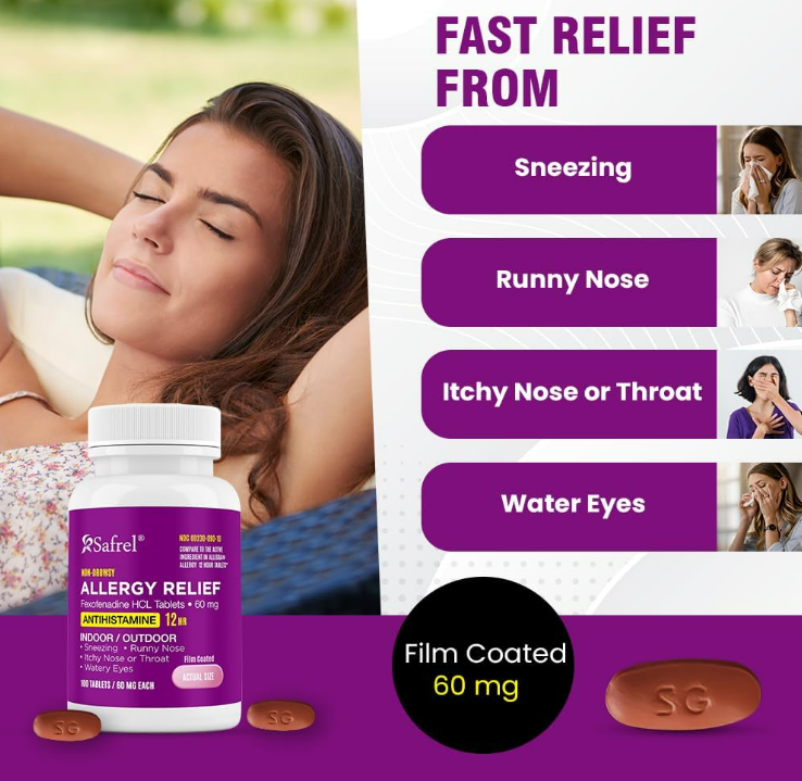 Safrel Fexofenadine HCl 100-Count Tablets Allergy Relief Non-Drowsy -Antihistamine-for Indoor & Outdoor Allergies - Runny Nose, Itchy & Watery Eyes Relief -12 Hour Support- Ideal for Children & Adults