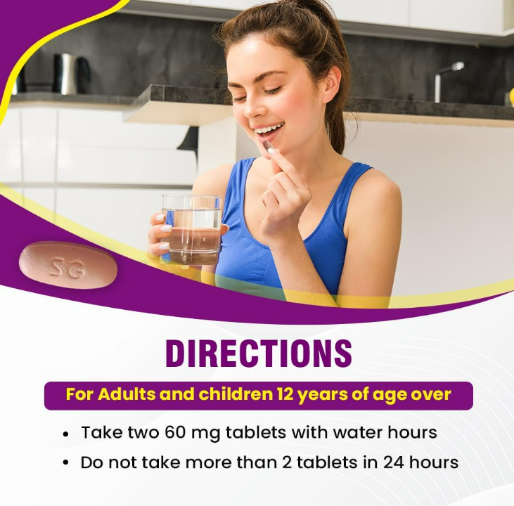 - Usage Instructions: Every 12 hours, take one 60 mg tablet with water. Twelve years of age and younger adults should not take more than two pills in a 24-hour period. It is advised that those who are 65 years of age or older consult a healthcare provider.