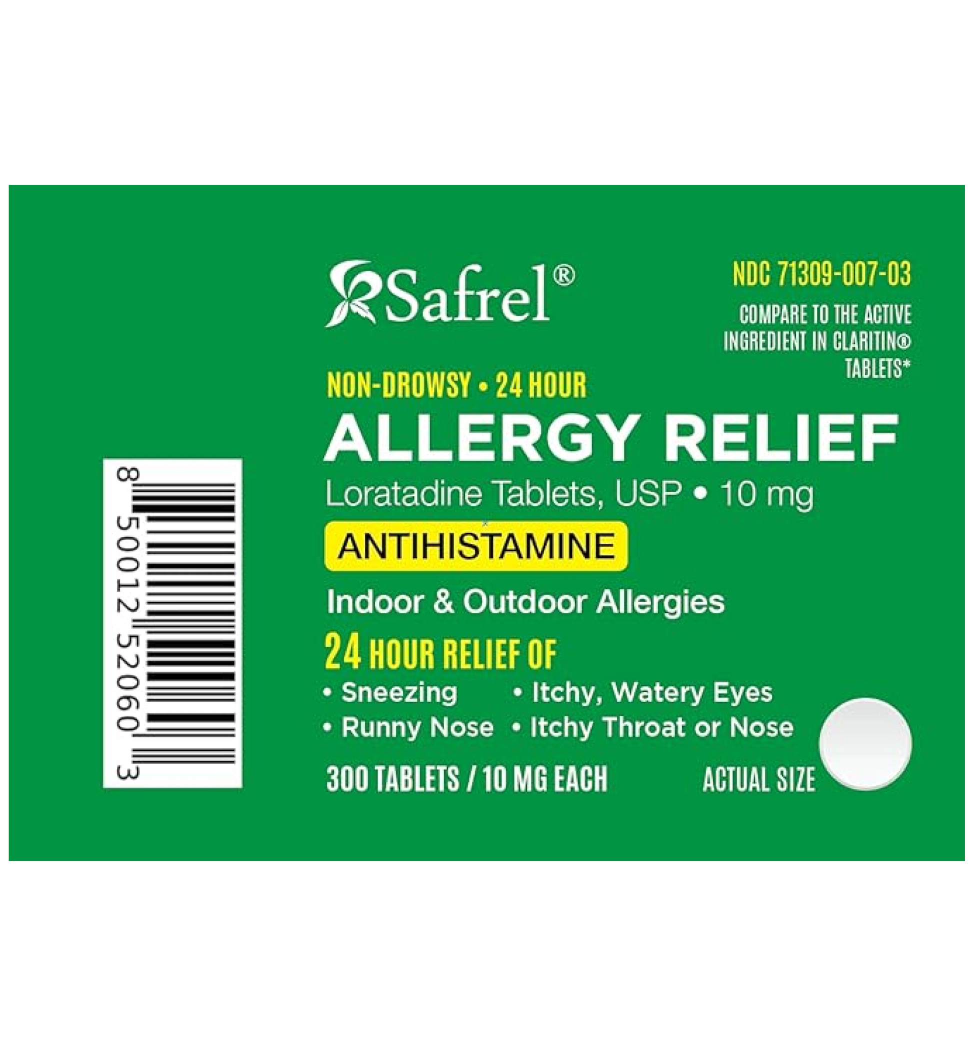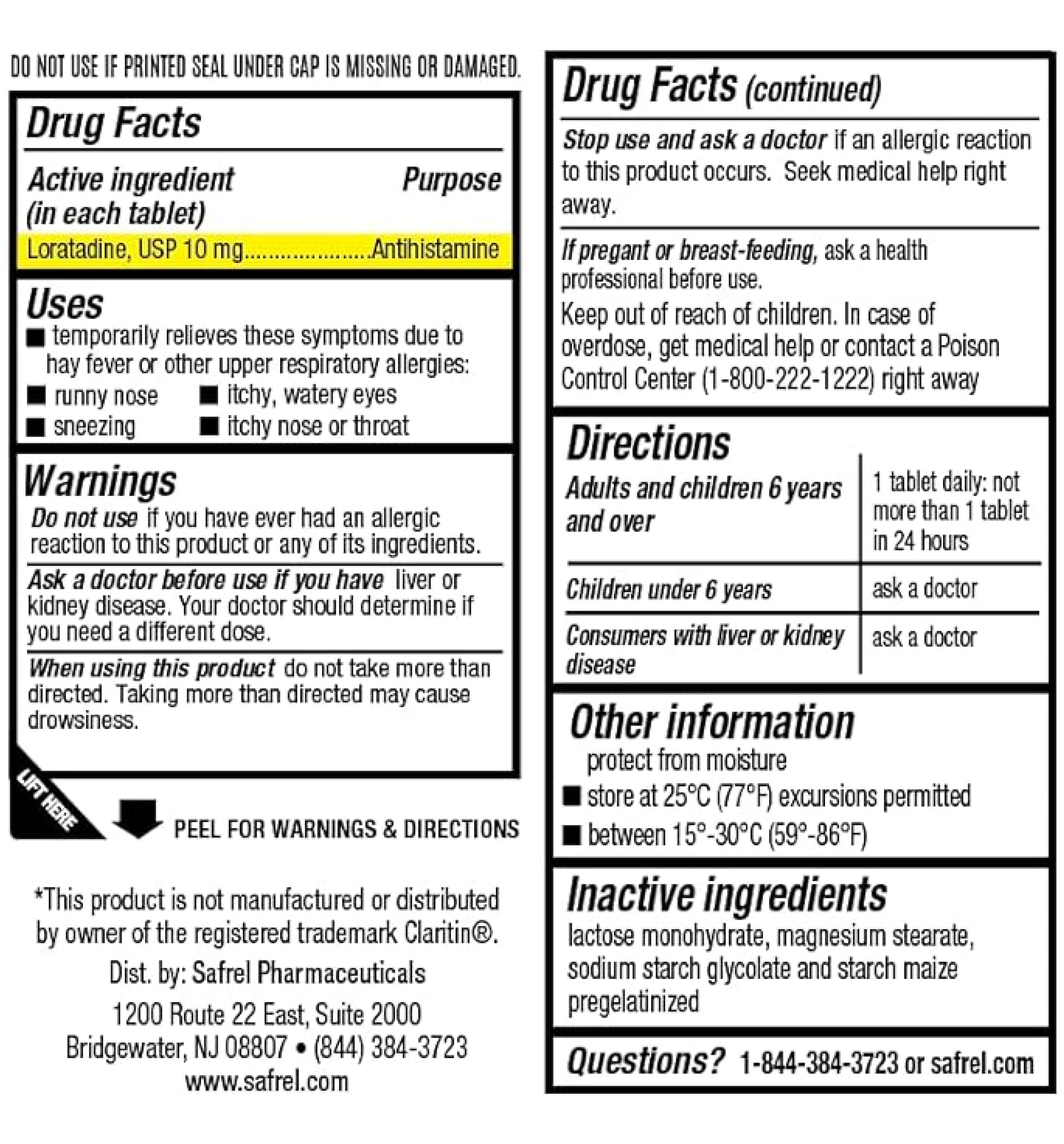 Safrel Loratadine 10mg 100 Tablets | Non-Drowsy 24 Hour Allergy Relief Medicine | Antihistamine Support for Runny Nose, Sneezing, Itchy, Watery Eyes | Compare to Claritin Tablets Prescription Strength