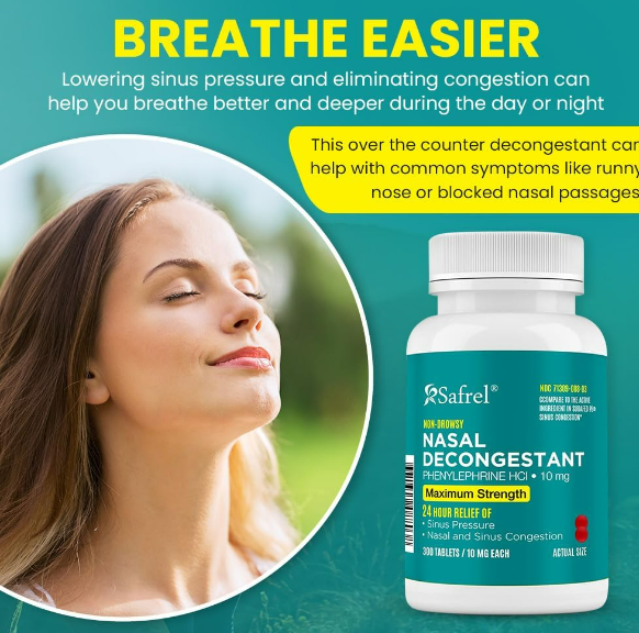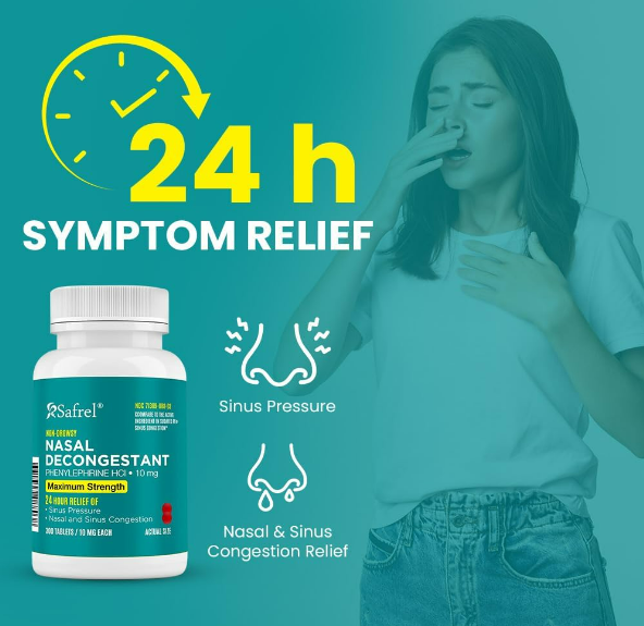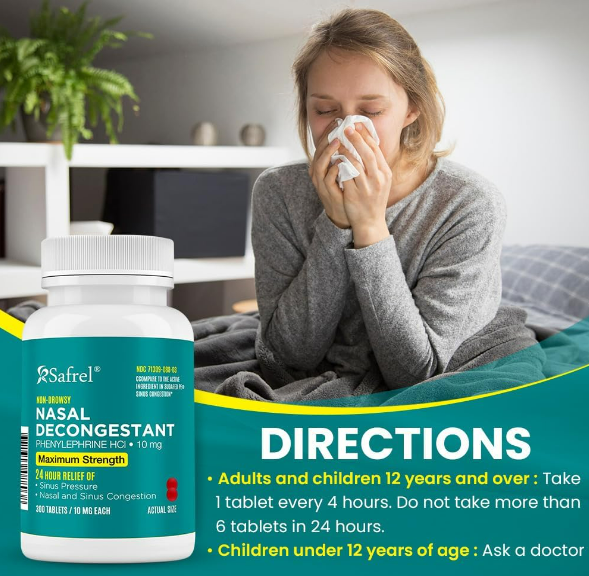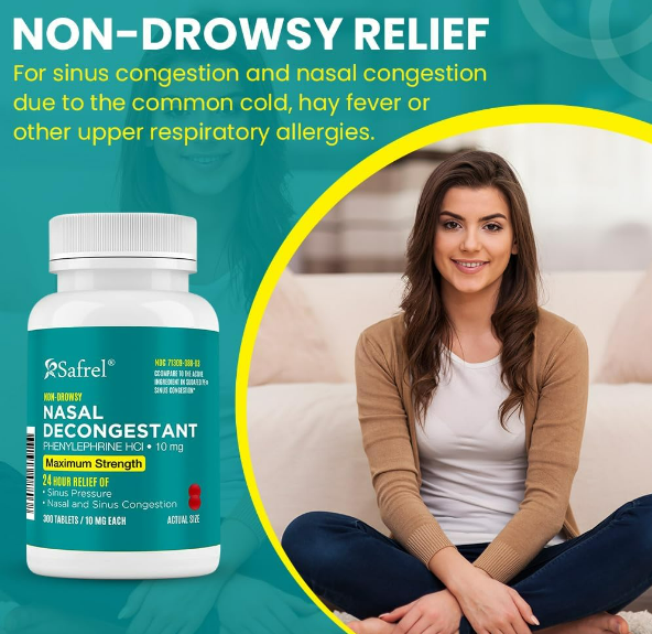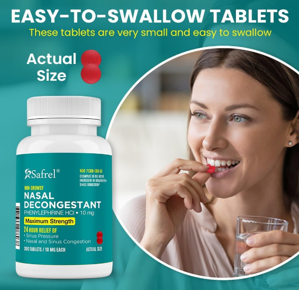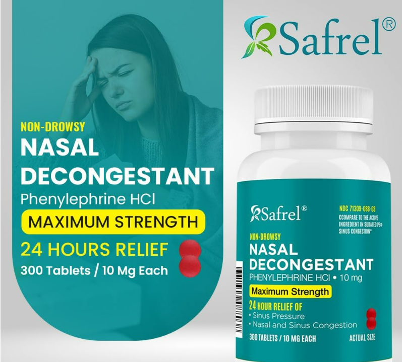 Safrel Nasal Decongestant PE - 300 Counts, 10 mg Phenylephrine HCl - Maximum Strength Non-Drowsy Relief for Nasal & Sinus Congestion from Cold & Allergies - Adults & Children