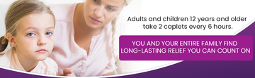 Provides relief from Headaches, Toothaches, menstrual cramps, arthritis, joint pain and more in one easy to swallow caplet. Adults and children 12 years and older : take 2 caplets every 6 hours.